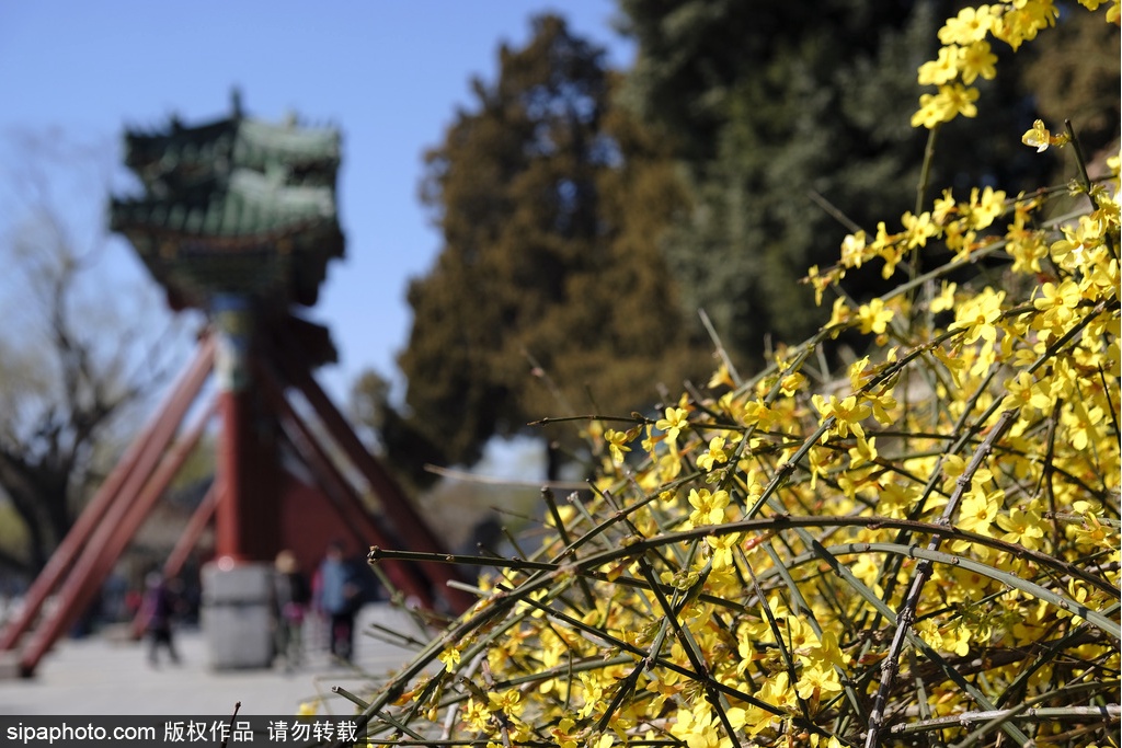 景山的迎春花分布在全园,株型铺散,柔枝拱垂,金黄可爱。在绮望楼前种植,为古建筑添加了一份春的气息。煤山上山道的迎春花伴随着游客的脚步依山而上,增添一抹春的脚步。