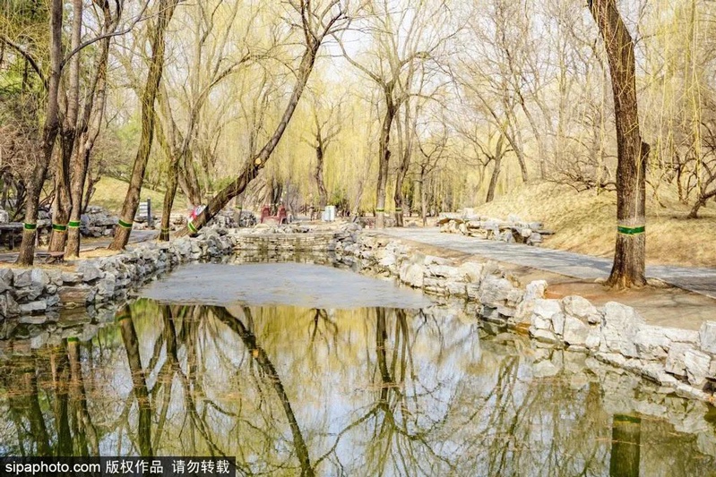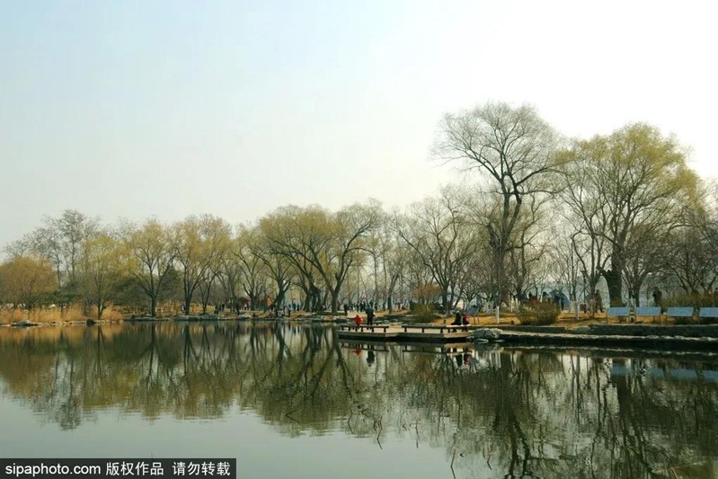 在圆明园,四季常绿的苍松翠柏自不必说,就是那些“光秃秃”的落叶树。仔细看去,透着绿,泛着黄,满满的都是春天的气息。