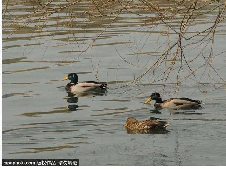 春江水暖鸭先知。一池春水中,野鸭和鸳鸯惬意游泳,追逐着水里的鱼虾,或是干脆彼此追逐嬉戏。忽然有一只就划破水面,呼啦啦飞到半空。