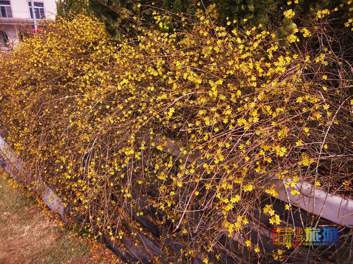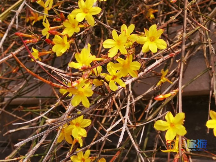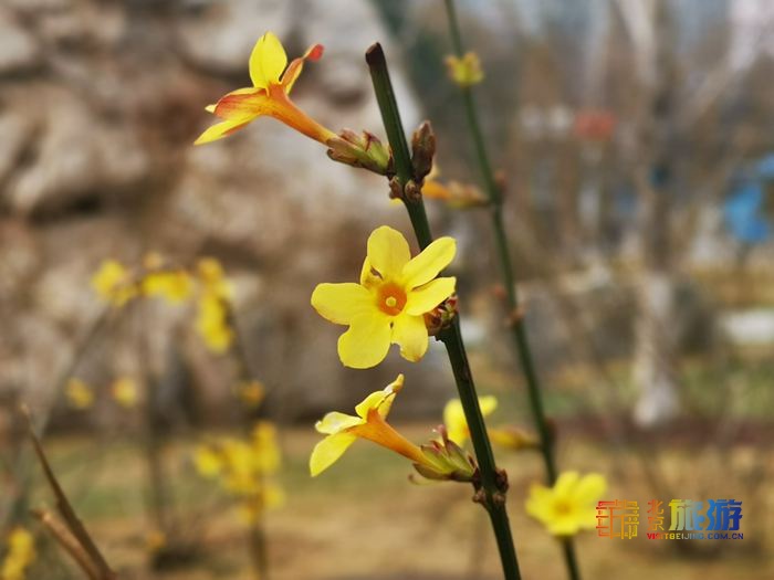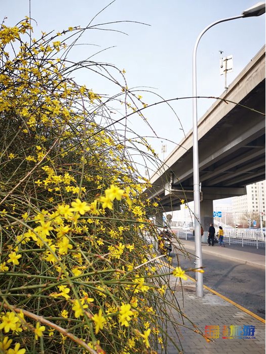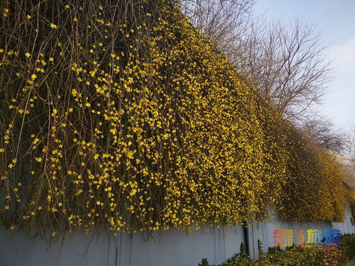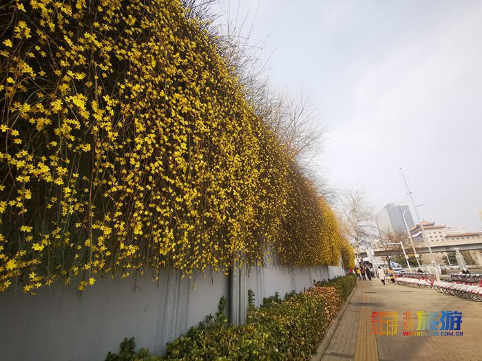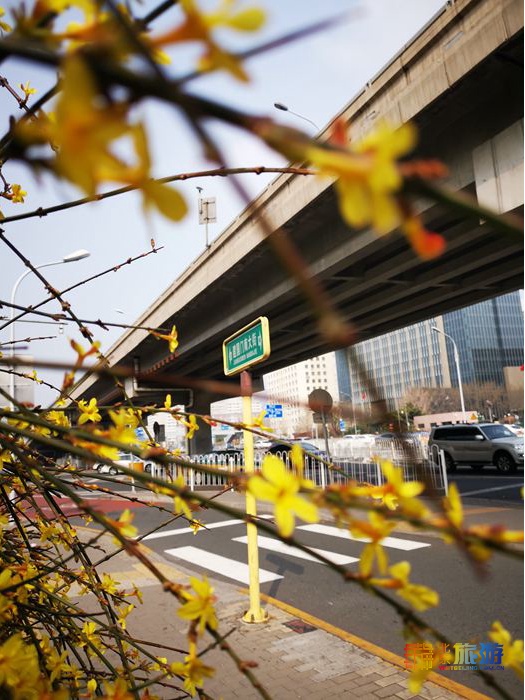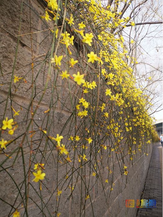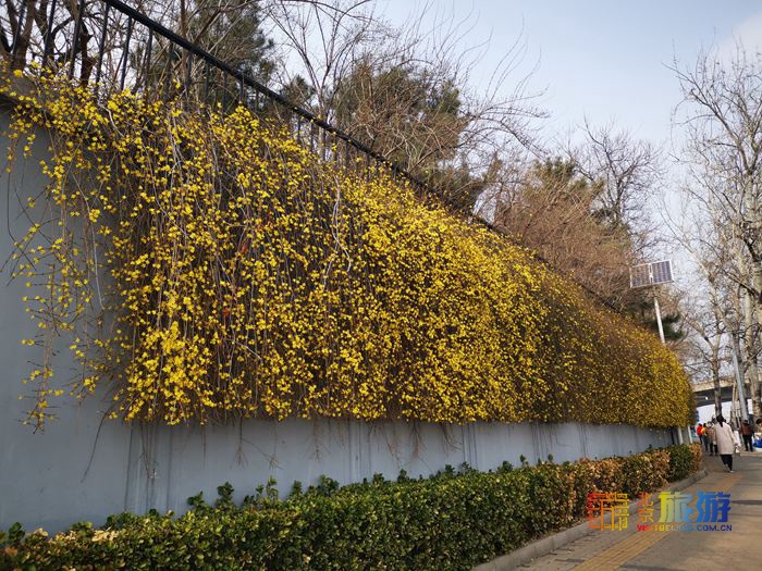 公园内的迎春花的具体位置则在公园靠近建国门南大街一侧,高台边密密麻麻垂下的迎春花形成了一面花墙,煞是壮观,十分好看。