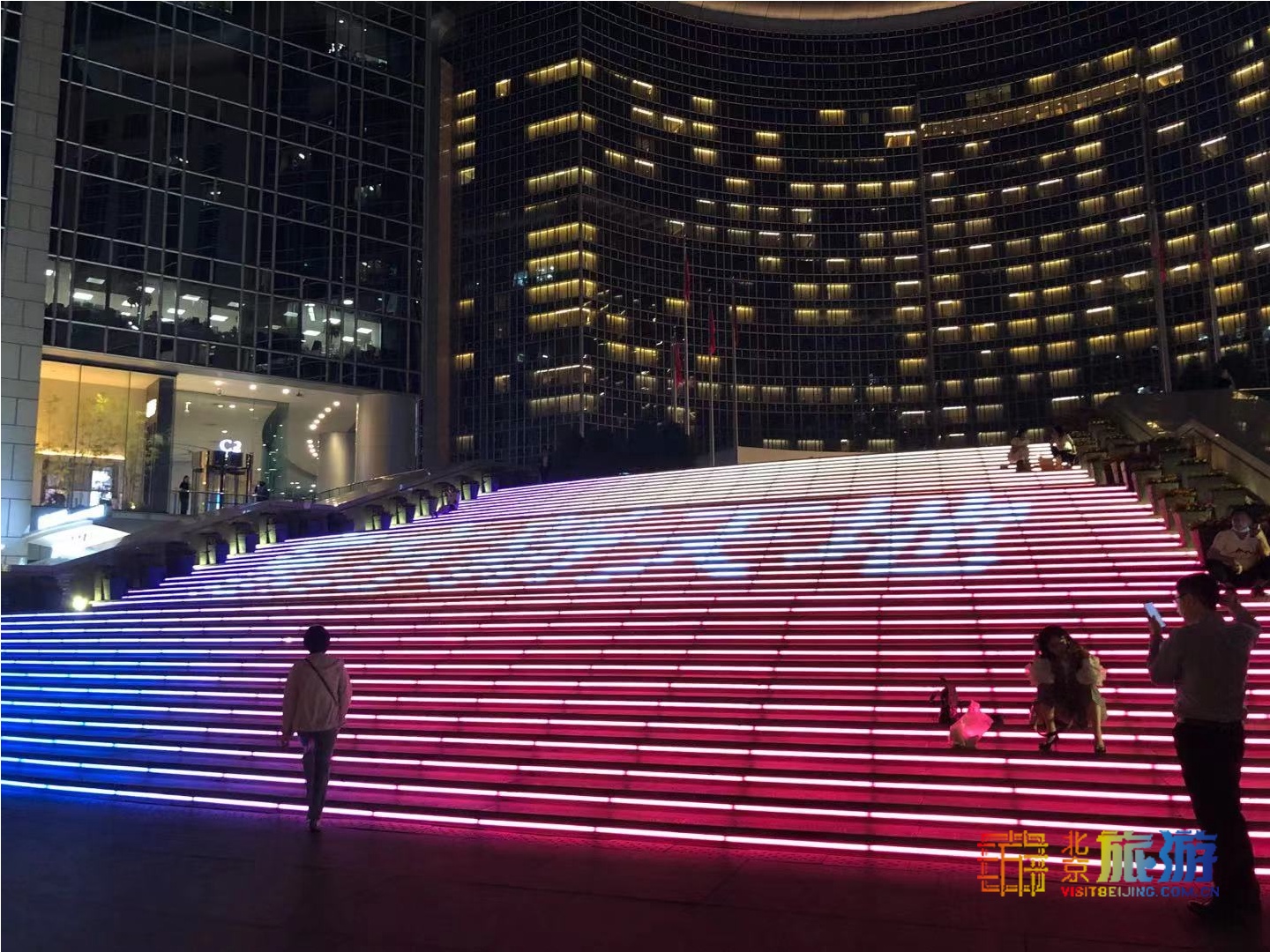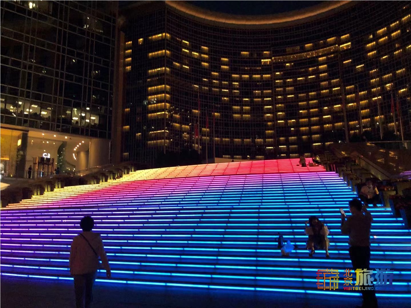 一级级台阶披上变幻闪烁的霓虹色彩,在长安街上成为一道令人瞩目的风景线~走到台阶上面,就可以看到电影里同款的大喷泉啦,转过身俯瞰着长安街,您一定能体会到到北京的小夜晚有多梦幻~快带着爱的人去打卡吧!