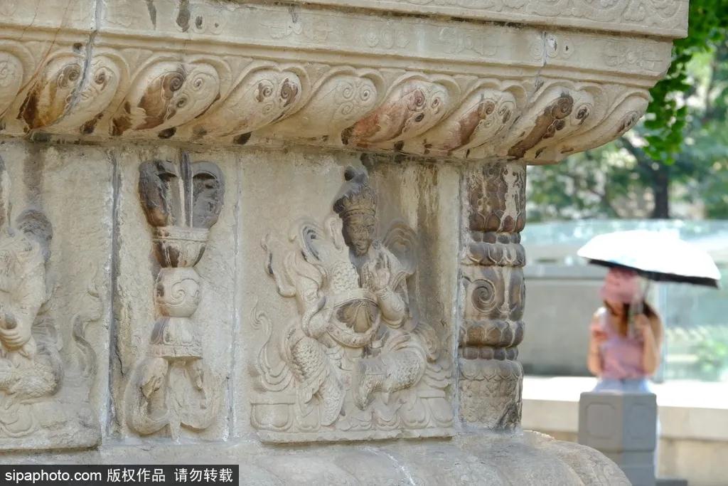 走近细看可以发现,塔座上雕刻有精美的梵文、菩萨、天王等佛教人物形象及狮子、孔雀等动物造型。