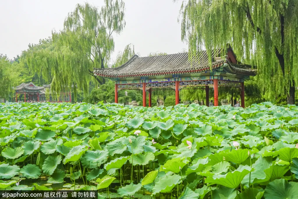 湖畔倚建着古色古香的水榭、画舫和小园亭,漫天的荷叶散发着清香,游人可以临水倚栏,尽赏风景~