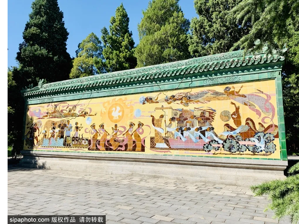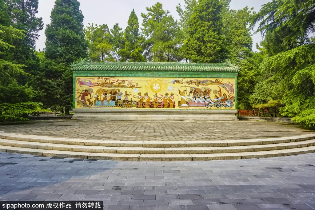 祭日壁画是一定要驻足细看的,壁画长15米,高6米,画面以祭日为主题,中央是“金乌”太阳神,上有飞天,下有帝王、群臣及百姓祭祀太阳神的隆重场面,两侧是“后羿射日”和“夸父追日”的传说。