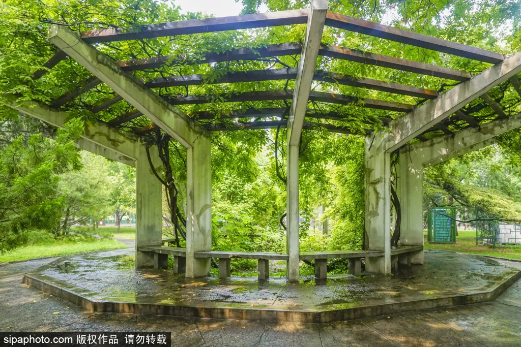 走累了,不妨找个地方歇歇。木椅随处可见,藤架下的阴凉处也是个不错的选择~