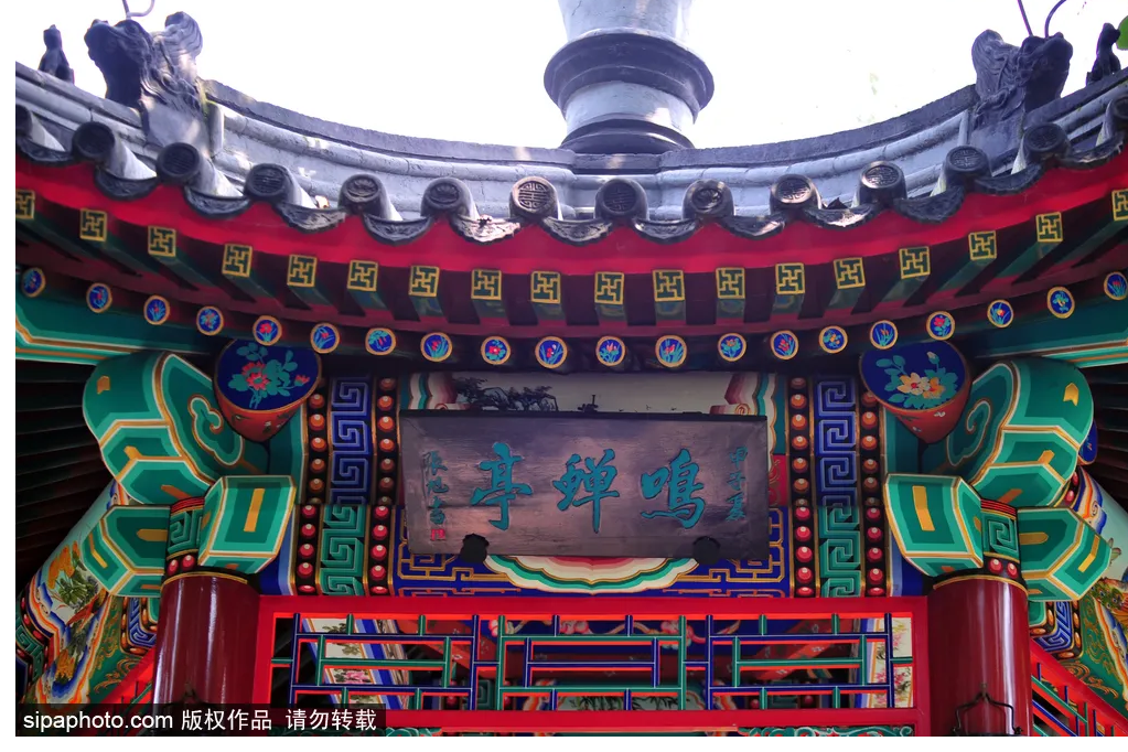 左岸池旁小山上,苍松翠柏中掩映着鸣蝉亭,形成了“蝉噪林愈静”的意境,鸣蝉亭联:“自得云林雅趣,且凭泉石清吟”。