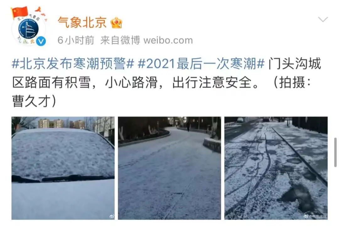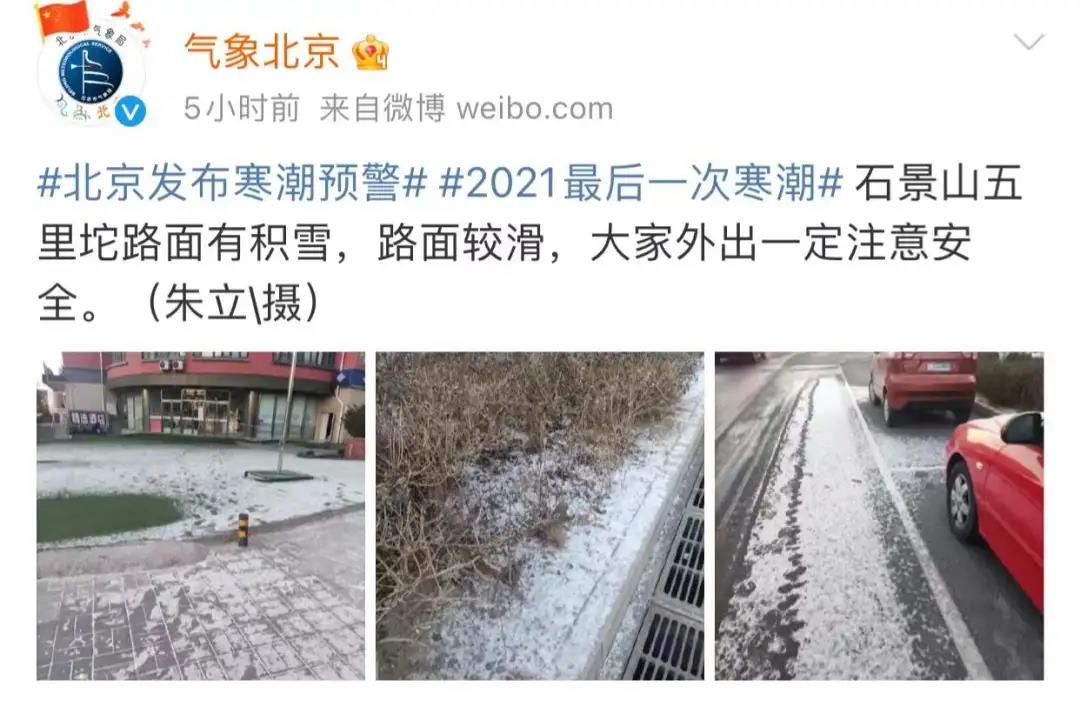 北京这两天的天气真是“冻”真格了,年末寒潮强势来袭。据气象北京消息,前晚石景山、门头沟等地出现降雪天气。