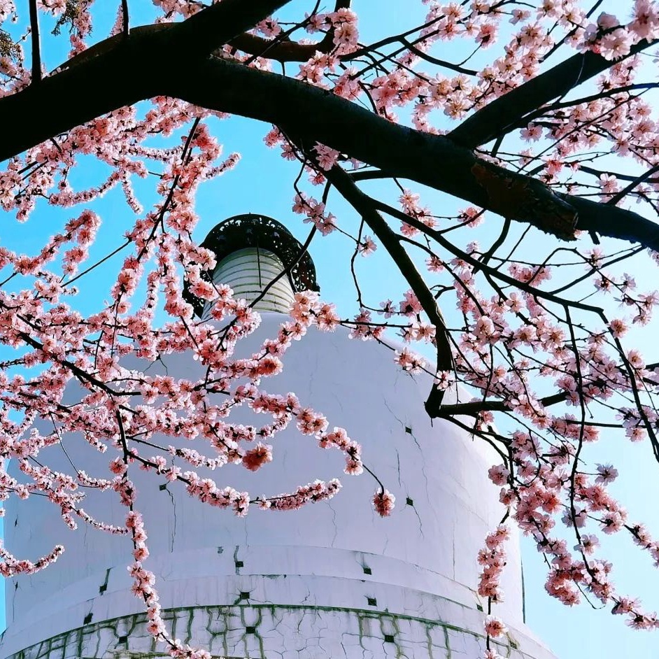 北海公园,山桃花开映白塔,花簇与古建相映生辉。
