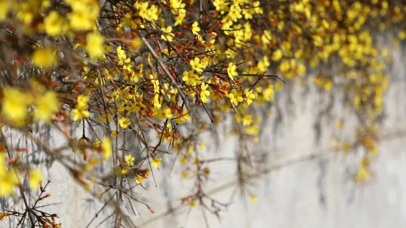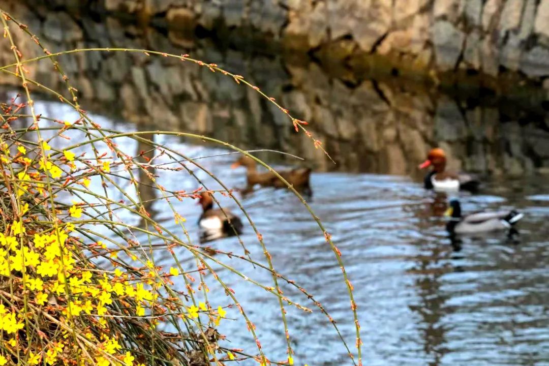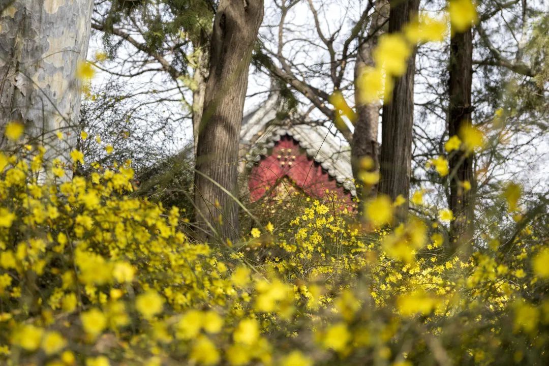 “此时,迎春花开正盛,满目金黄,与园林建筑、湖面、山石相映,道出春天的生机勃勃。