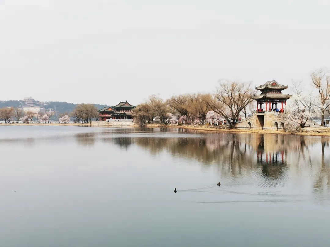 颐和园西堤,柳枝吐绿、山桃盛开,花中走如画中游,