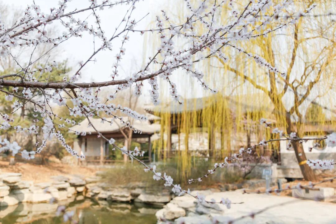 中国园林博物馆,山桃、柳枝与轩榭相映,春意盎然。
