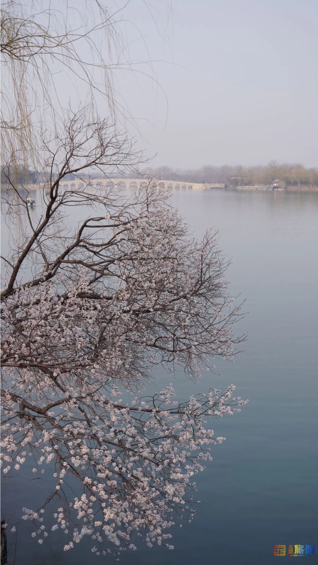 晴朗的天空下,拍下一张照片,红霞粉雾般的桃花,掩映着蔚蓝的湖水,与远处的佛香阁、十七孔桥等古建同框,美景如画一般~
