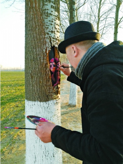 艺术工作者于先生告诉记者,一个月前,他的女儿在这片树林散步时,感叹树疤的造型很像“刺猬”,这带给他创作的灵感。他查询资料后,发现用丙烯染料作画不会伤害树木,又有抗腐蚀作用,便每周带女儿到树林作画。