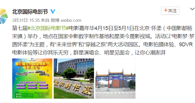 北京国际电影节官方微博3月31日发布消息称,第七届“北京国际电影节“电影嘉年华4月15日至5月1日在北京·怀柔(中国影都杨宋镇)举办,地点在国家中影数字制作基地和星美今晟影视城。
