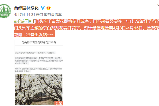 北京市园林绿化局官方微博日前发布微博称,4月8日-4月15日,门头沟军庄镇的京白梨梨花进入最佳观赏期,再不来看又要等一年。