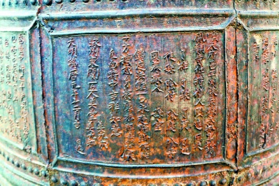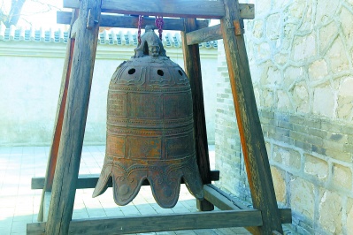 我们在正殿东侧发现了明代铁钟,悬挂在木制支架上,高为1.55米,底部周长2.9米,铸造于明万历元年(1573年)。铭文为瘦金楷体,笔划遒劲有力,字迹清晰。正中部位铸有“皇图永固,帝道遐昌,佛日增辉,法轮常转”字样,周围饰以花纹,每字5厘米见方。其余为铸造和捐助者姓名,共记有16个村329名信众捐资。钟肩、钟腰和钟口处均饰以花纹,钟钮为龙形。从铭文中可知当时仙台村为昌平州怀柔县木林里所属。据传说,这口铁钟曾被借往红螺寺,竟然怎么敲也不响。而在凤翔寺内,钟声锵锵,清脆悦耳,声闻数十里,可与红螺寺的钟声遥相呼应。时有“凤翔钟声响、十里太平声”的说法。