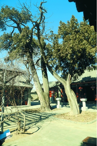 两株古柏位于大殿前侧,一株干径1.2米,高16米;另一株干径70厘米,高10米,均为一级名木古树,冠盖若棚,铁骨铮铮,气势非凡。嘉庆碑文记载:“院内有古柏二株……疑是千余年物,故居人皆言唐柏。”此为怀柔唯一有碑文记载的唐代古柏。唐代于今,少说也有1200多年了。岁月脱去它们的树皮,枯干了树冠的枝杈,却在树干上留下了美丽的谁也看不懂的经文符号,这是大自然显示的密码,岁月留下的痕迹,是有生命的活文物。