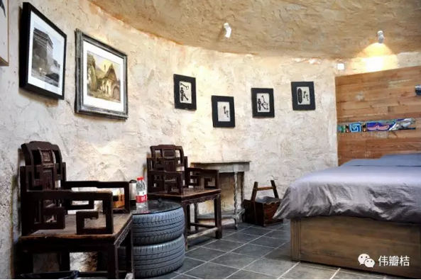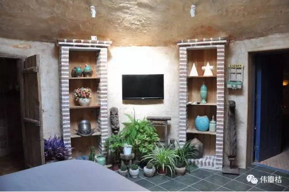 里面则像真的洞穴一般,黄色的灯光透出温暖,孩子们在曲曲折折的走廊中跑来跑去,颇有些探险的感觉。客房便隐身其中,木门、木床、木椅无不显示出自然的风格。床上铺着棉麻的床品,房间里点缀着茂盛的绿植,涂色的轮胎做成的茶几,红砖砌成的置物架,墙角摆放的盾牌……每一样都让房间显得质朴而舒适。用遥控器打开屋顶圆形的天窗,房间刹那间明亮起来。静谧的夏夜,躺在床上就能看到点点星光。