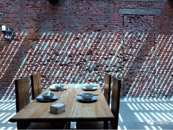 一片阳光被细细的横梁切割成一根一根,透过玻璃天窗斜斜地投射到斑驳的红砖墙上,餐厅的环境好到让人不愿离开。