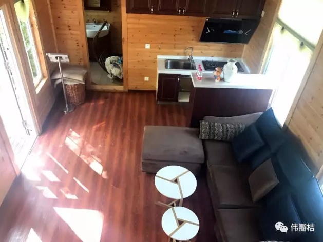 厨房、卫生间、浴室、沙发,木屋内的设备一应俱全。