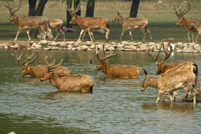 麋鹿原产于中国长江中下游沼泽地带,以青草和水草为食物。性好合群,善游泳,喜欢以嫩草和水生植物为食。曾经广布于东亚地区。后来由于自然气候变化和人为因素,在汉朝末年就近乎绝种。元朝时,为了以供游猎,残余的麋鹿被捕捉运到皇家猎苑内饲养。到19世纪时,只剩在北京南海子皇家猎苑内一群。清末被带去欧洲,从此在中国消失。直到1898年被英国购买并繁殖到255头,并在1983年将部分个体送回中国,之后有更多的麋鹿回归家乡。