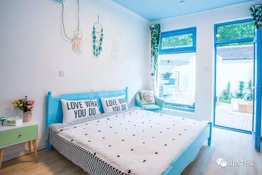 进入庭院,满眼绿色,还有色彩斑斓的花朵点缀着,这里的一切似乎都能唤醒童年,你随意的走着,四处追寻那些童年的趣物。秋千架、玻璃瓶、小鸟巢和玩具娃娃,漂亮的捕梦网就挂在床头,不知道又捉到了几个美好的梦。庭院中间是吃饭,闲聊的地方,晚上和家人朋友坐在那里,听虫鸣,赏月色,谈天说地,像初夏一样,满怀柔情。到了晚上,听着虫鸣的声音走出房间,院子里星星点点的灯光,造就一番萤火虫之梦。