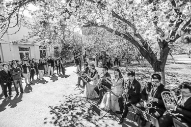 昨天,顺义区牛栏山镇耿丹学院内500余株各色樱花盛放,一树粉红樱花下,学生为前来赏樱的市民表演乐曲,近日天气晴好,不少市民来到京郊各处品味春意。
