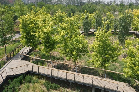 设计上,则注重生态设计理念,选择选择乡土、长寿、抗逆、食源、美观的树种,构建“复层、异龄、混交”的近自然地带性植物群落,形成稳定的森林生态系统。在功能上,还充分考虑生物多样性恢复和城市森林功能的发挥,为鸟类等野生动物提供食源、隐蔽场所和迁徙通道,适度打开绿化隔离带,为市民休闲游憩、健身疗养、体验教育等拓空间。