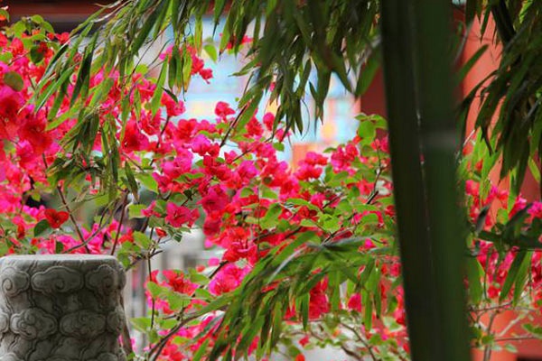 除了国色天香的牡丹、馨香烂漫的紫藤外,红螺寺门区及各游览线路上盆栽的三角梅、小牵牛、串红、富贵菊等花卉将红螺古寺装扮得更加美丽迷人,千年古刹红螺寺穿上鲜花的盛装,以满园缤纷春色静待游人的到来。