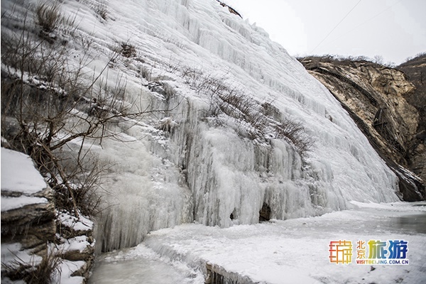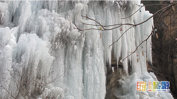 京都第一瀑,这是京郊流水量最大的瀑布,落差62.5米。冬季,随着气温的逐渐降低,流水结冰后层层叠叠,漫延至石壁四周,形成京都第一冰瀑,远远看去似一条玉雕的巨龙从崖壁上垂头汲取冰潭中的水;近看像天上的银河飘落在石壁之上,令人心动。