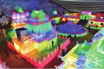 “片片鲛冰,吐清辉而交璧月,行行龙烛,腾宝焰而灿珠杓。”晶莹剔透的冰建筑,栩栩如生的冰雪雕塑,炫彩闪耀的灯光秀,“乐享冰雪 相约世园”第三十三届龙庆峡冰灯艺术节用冰与雪雕琢了“长城脚下的世园会”,为游人带来了一场冰雪视觉盛宴。