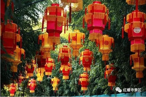 “祈福游园会”期间红螺寺景区将在门区外、门区小广场、文化长廊、竹林甬道和寺庙区布置装饰由景区自主设计、加工制作的16种5000余盏多型各色宫灯。今年景区新加工的多体“福”字宫灯也将集体亮相,使游人一进入景区就会有“万福迎春、身临福海”的吉祥美好感受。
