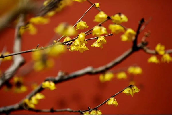红墙内外,含苞待放的蜡梅伫立枝头,引来爱梅之人光顾。梅花藏有暗香,味道总是淡淡的,却令人着迷。日光的照射下,金黄色的蜡梅以寺庙红墙作底案,总是显得格外诱人。趁着周末,约三五好友一起去赏梅吧!