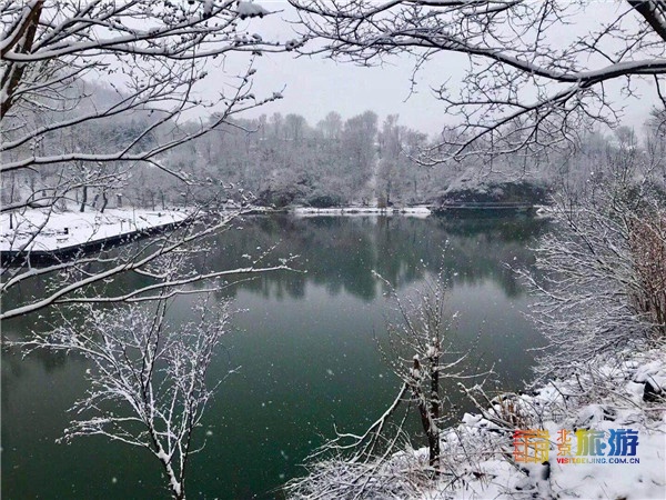 雪花飘落在树枝上,平静的湖面绿得像一块翡翠,和白色的雪花相互映衬,有一番别样的宁静!