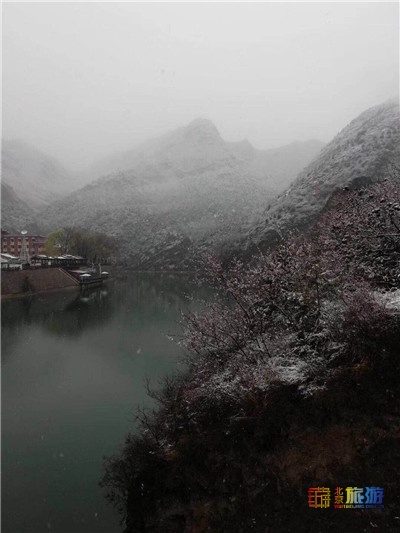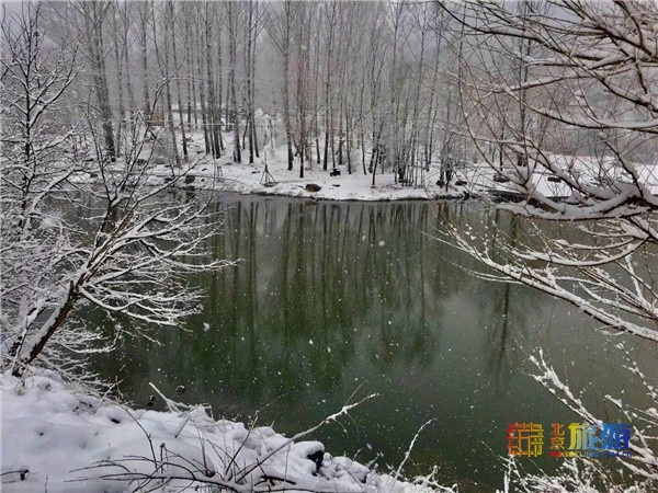 龙庆峡本就美,雪中的龙庆峡更是美得不可胜收!一夜之间,山上一片白色,山下桃花开得正盛,平静的水面好似一块绿宝石,散发着迷人的光芒,让人忍不住想要采撷!
