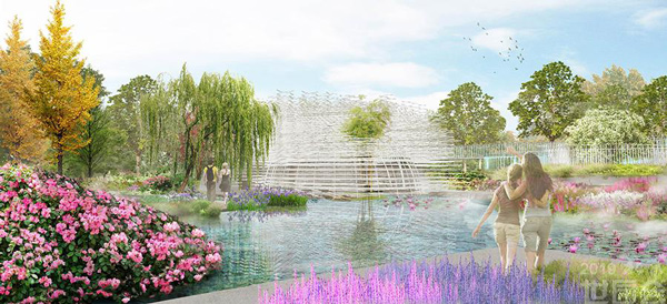 众“云”之中,点睛之笔当数园中心的“云巢”。这是一处金属景观构架,既是一个展示中心,又是全园的视觉焦点。构架表皮由铝镁合金制成,由于表皮构件的疏密叠加,在园中不同视角望去,展现出如天上流云一般的变幻效果,如梦似幻。