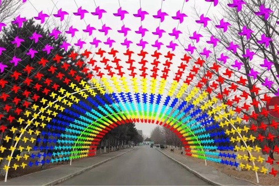 在转盘区域、16号影棚东侧干道、美食广场等区域,以电影节风车LOGO为设计灵感,布置风车墙、风车矩阵、风车长廊,烘托嘉年华活动的现场氛围。