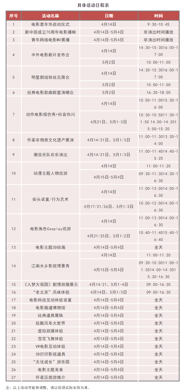 在主舞台播映新中国成立70周年经典电影。以“国兴家和”为主题挑选30余部经典影片,展示新中国在不同历史时期的电影文化成就,展现中国故事与中国形象。4月14日-5月4日,计划每天上下午各一场,遇其他演出播放时间顺延。