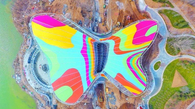 “永宁高阁揽盛景,天田妫(guī)汭(ruì)蝶飞舞。”作为世园会开闭幕式的主会场——演艺中心,从空中俯瞰,绚丽多彩的屋面如同翩跹起舞的蝴蝶。