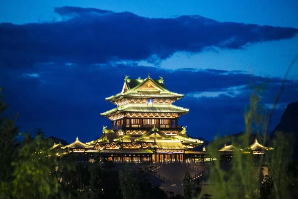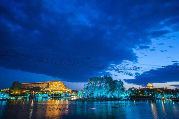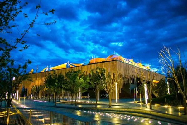夜幕中,灯光渐渐亮了起来,百果园的“红花”开的更加闪亮,妫汭剧场这只蝴蝶扇动流光溢彩的翅膀,带我们走进光影的奇幻世界,金色的宫殿庄严肃穆,这里是否是你向往的地方?