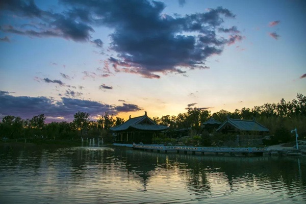 植物馆前的池水波光粼粼,百草园的小河倒映出重重云幕,文人园依旧保有那一份宁静的诗意,在黄昏的微光里,静静流淌。