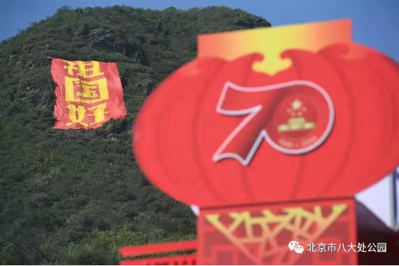 由公园全体职工共同织绣,占地近万平的大型山体布雕艺术品——祖国好,登上虎头山顶,共庆中华人民共和国成立70周年。