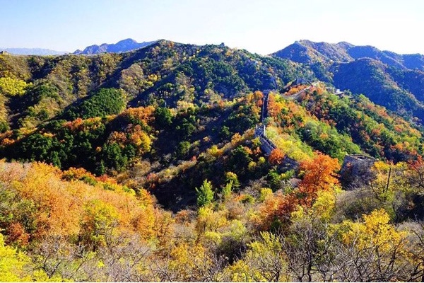 十月中旬前后,是慕田峪长城最绚烂恣意的季节,秋高气爽,云淡风轻。进入十月份,慕田峪长城旅游区内3000米的红叶带渐次染色,色彩斑斓的红叶映衬着雄伟壮丽的长城,为我们勾勒出一幅幅如诗如画般的金秋胜景,让游客尽情享受如梦似幻的长城“枫”情。长城台阶比较陡峭,可选择乘坐缆车上山。