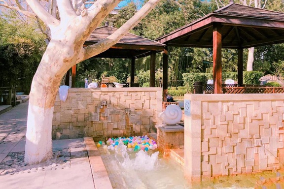 葱郁的密林间散落着不同的泡池,有木瓜汤、红酒浴、巧克力浴等。欢笑之中,享受温泉的滋养,亲子推荐—环湖泡池,温泉水轻抚着圆润的卵石,和孩子一起体验大自然的乐趣,拥有高温、中温、低温泡池区,大人、孩子可自由选择。