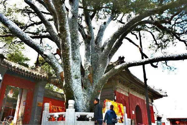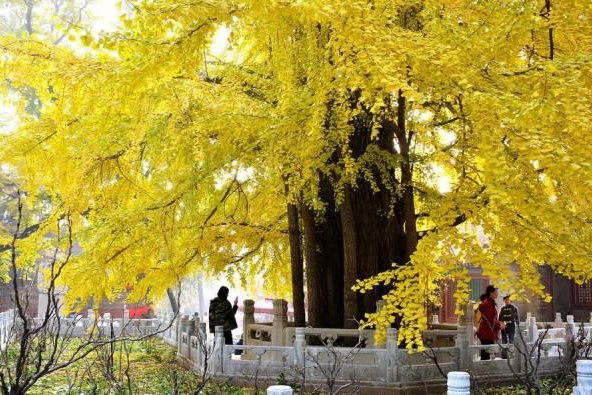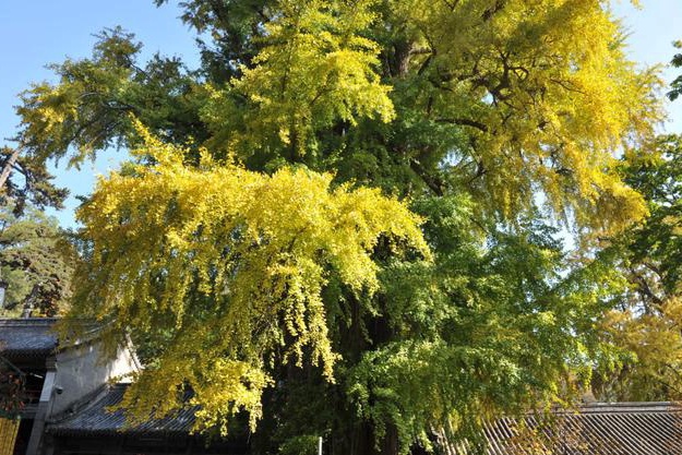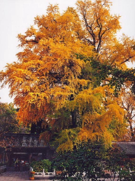 银杏树被称为神奇的树种,它是高大的落叶乔木,树干挺拔,树形优美。戒台寺雌雄同株的银杏树是非常罕见的。