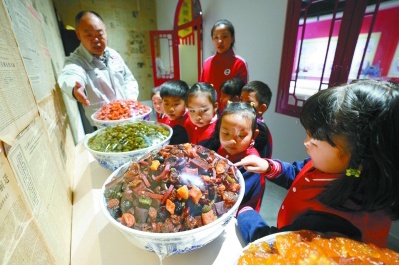推开两扇红色大门,步入果脯博物馆展厅。展陈由果脯溯源、北京果脯发展史、北京果脯传统制作技艺、果脯工艺与器具沿革、果脯文化和红螺食品企业史等五部分组成,展览形式包括文字介绍、图片、雕塑、实物、档案资料、场景还原等。展厅里,有一面灰墙拱券门窗、红色门板窗框的门面房,门头上写着“聚顺和栈 南货老店”,再现了北京果脯老店聚顺和当年的模样。博物馆仿建了门脸儿进行展示,走进屋里,桌上一溜儿青花瓷大盆里盛着冒尖的果脯一如当年模样。选料、原料初加工、清洗护色、发酵、制作饴糖、糖制、晾晒、整形包装……文字说明配以人物雕像和各种实物工具,展览情景再现了北京果脯传统制作工艺的八大步骤。展厅里还展示了历代盛放果脯的食盒以及各色果脯包装纸。