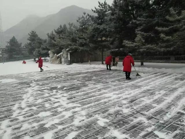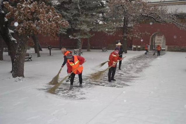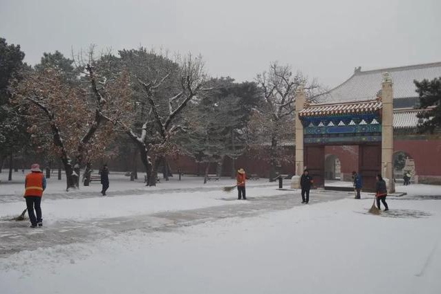 为方便游客参观游览明十三陵及安全出行,12月16日,明十三陵各景区工作人员积极参与到扫雪除冰的活动中。