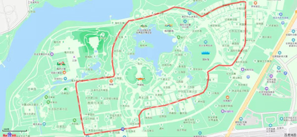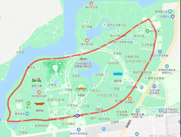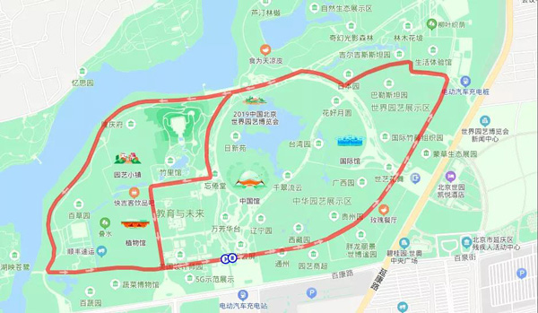 路线:一号门——园区南路——生活体验馆——国际展园北路——妫汭东路——园区北路——园区南路——生活体验馆——国际展园北路——园区北路——妫汭东路——园区北路——妫汭西路——园区中路——植物馆东路——园区南路——一号门