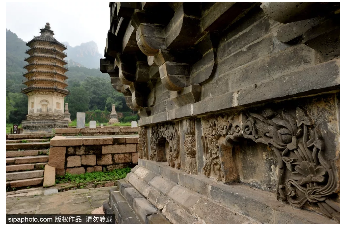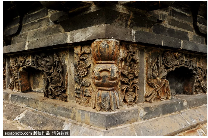 在这其中,最壮观的还得是法华禅寺内的金化佛塔,这里有五座密檐式砖结构塔,三座为十三层,两座为七层,都是正八边形结构。这些塔塔基为莲花造型,塔身四面设有券门,雕刻佛像,一个个栩栩如生。