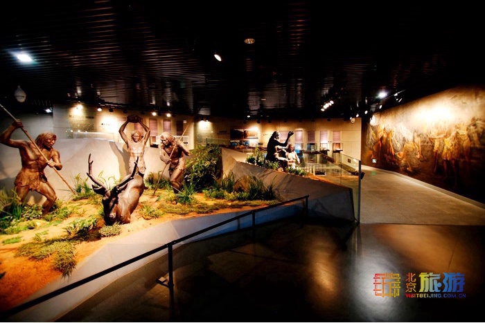 走进博物馆大厅,一个高大的猿人塑像迎面而立,进入内部,按照时间顺序可以陆续参观三个展厅。第一展厅内主要介绍周口店遗址的发现和发掘历史,其中有“北京人头盖骨”复原模型;第二展厅主要介绍的是“北京人”时期的生产、生活、环境:这里复原了“北京人”生活时期的场景,展示了距今30~70万年前周口店地区的自然环境和“北京人”用火、打制石器、采集、狩猎等生产生活活动;第三展厅介绍的是周口店遗址发现早期智人和晚期智人的化石地点,并以场景再现了山顶洞人的生产生活方式。